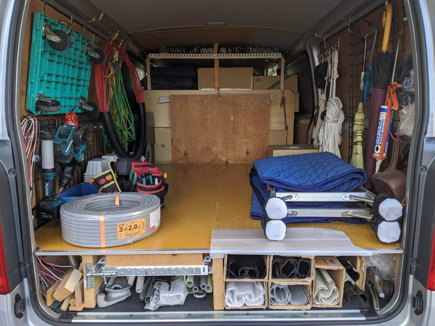 当たり前ですが、工事に必要な工具・材料は常時積載ですし、工事する商品(エアコンなど)の積載もあるので、